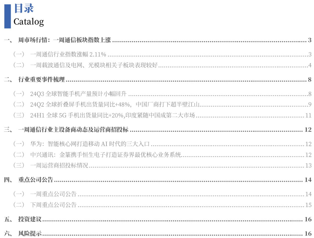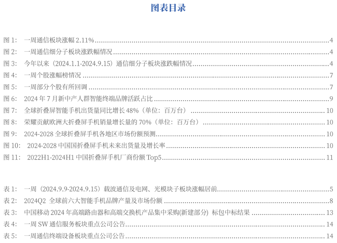 Q2全球折叠屏智能手机出货量同比增长48%,中国厂商打下超半壁江山。根据TrendForce统计,2024Q2全球智能手机产量下降3%,预计第三季度产量将微幅增长至2.93亿部。Counterpoint数据显示,2024Q2全球折叠屏智能手机出货量同比增长48%,主要受西欧、亚洲和拉丁美洲市场推动,中国占全球折叠屏手机市场出货量的一半以上。IDC预测,2024年中国折叠屏手机市场出货量将达到1,068万台,同比增长52.4%,预计到2028年将超过1,700万台,五年复合增长率为19.8%。运营商方面,中国移动投产的哈尔滨智算中心,首次商用中国移动原创的全调度以太网(GSE 1.0)技术方案,将训练过程中的通信时间占比缩短20%以上,达到国际领先水平。中国电信自主研发的物联感知云平台,在IDC的中国城市物联感知平台排名中以14.3%的市场份额跃居中国市场前二。中国联通智网创新中心凭借“网络大模型+AI智能体双引擎,赋能中国联通网络优化创新实践”项目,斩获金砖国家工业创新大赛一等奖。主设备商方面,华为发布了《核心网迈向智能世界白皮书2024》,强调了5G-A智能核心网从联接增强到超越联接,用三大智能打造三大入口,助力运营商抢占AI时代业务入口和重塑运营模式。中兴通讯的金篆分布式数据库与恒生电子的UF3.0新一代证券核心业务系统完成了兼容性互认证,为证券行业提供创新、安全、稳定的金融级分布式数据库产品。基建及政策方面,工信部印发《关于推进移动物联网“万物智联”发展的通知》,旨在提升移动物联网行业供给水平、创新赋能能力和产业整体价值,加快推动移动物联网从“万物互联”向“万物智联”发展。