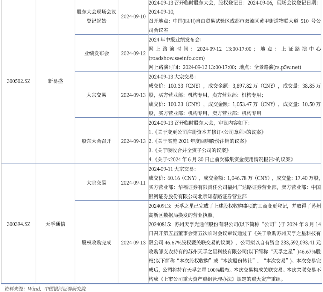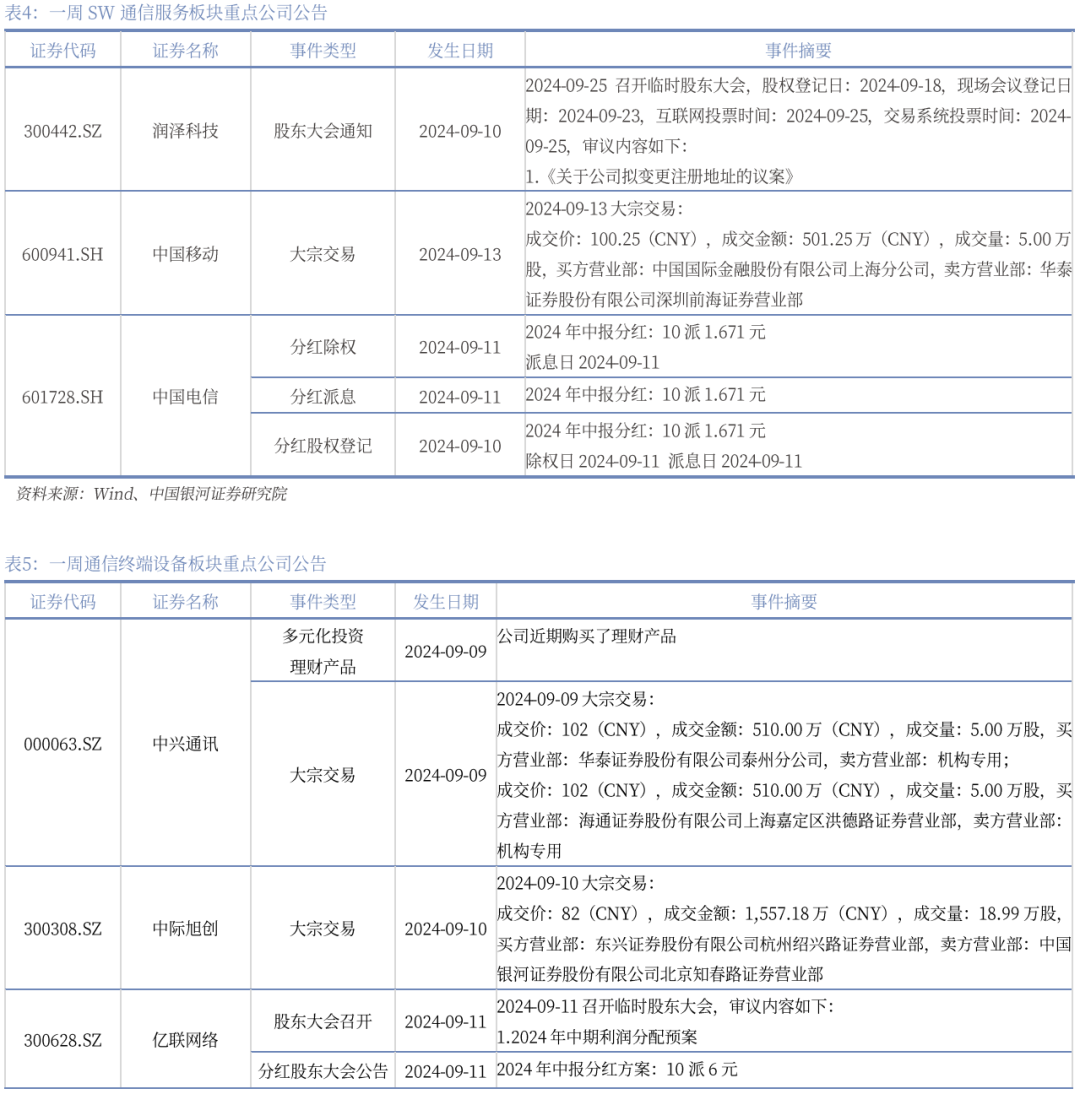 本周SW通信服务、SW通信设备子板块中无重点公司公告(公司选择范围:截至2024年9月15日市值不低于200亿)。