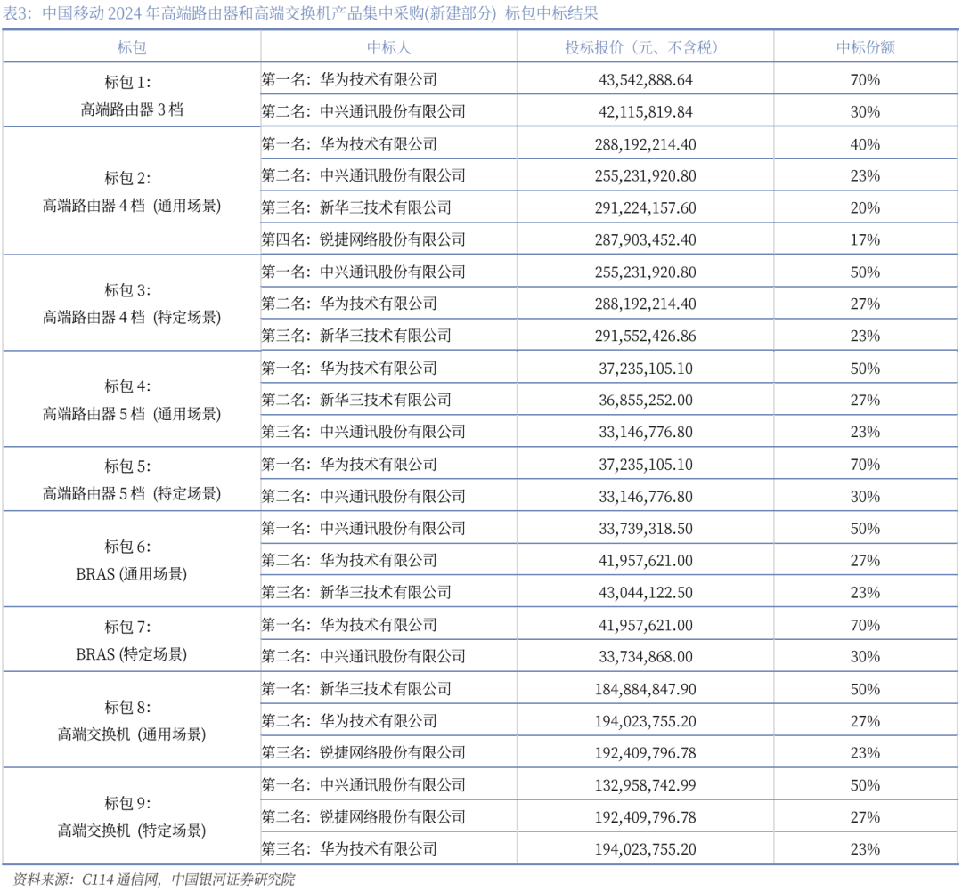 从中国移动官网获悉,中国移动近日公示了2024年高端路由器和高端交换机产品集中采购(新建部分) 标包的中标结果。从该次中国移动新建部分高端路由器和交换机产品的中标情况看,总中标金额约为109869.6898万元(不含税),共4家瓜分,分别为华为、中兴、新华三和锐捷。其中,华为共中标9个份额,总中标金额约为40596.1701万元(不含税),无疑是最大赢家;其次为中兴,共中标8个份额,总中标金额约为30999.1331万元(不含税);新华三此次中标5个份额,总中标金额约为23759.5379万元(不含税);锐捷此次共中标3个份额,总中标金额约为14514.8485万元(不含税)。