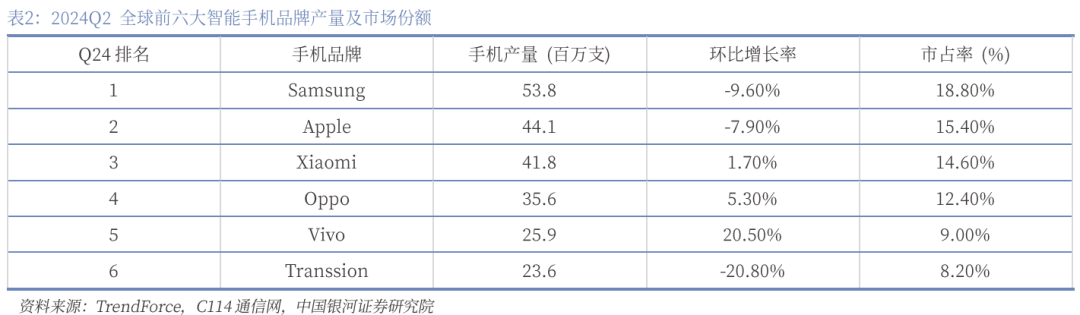 2. 苹果(Apple):在第二季度,苹果公司的智能手机产量约为4,410万部,虽然环比下降了8%,但同比增长了5%,这可以看作是为了应对中国618电商促销活动的提前备货。由于苹果公司在中国市场的降价策略效果显著,预计这将促进第三季度的生产表现。此外,苹果公司计划在9月发布四款新机型,预计2024年新机型的总产量将超过8,600万部,同比增长近8%。