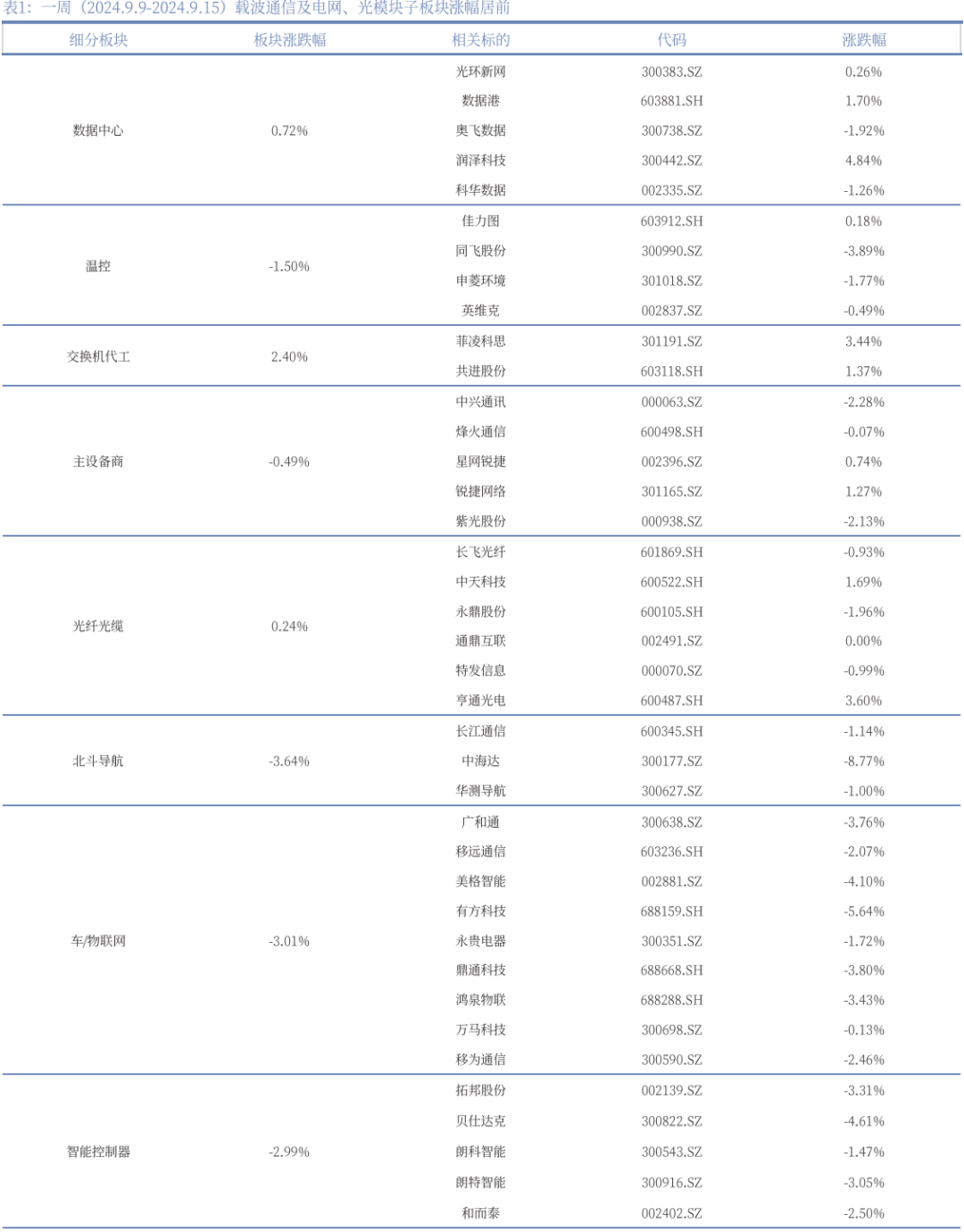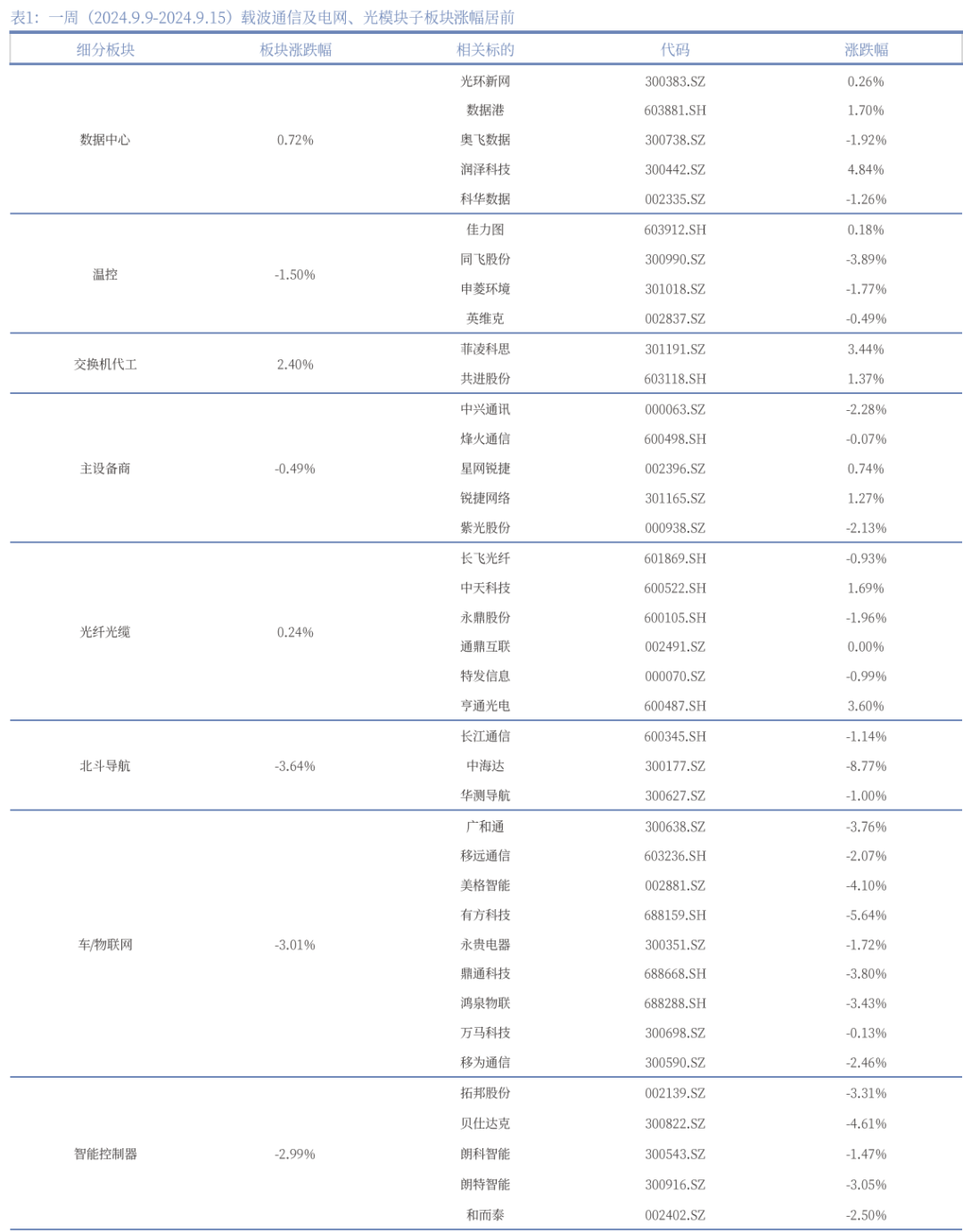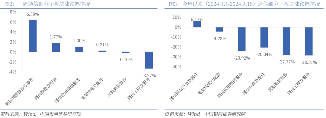 周行情:一周(2024年9月9日-2024年9月15日)上证指数跌幅为2.23%;深证成指跌幅为1.81%;创业板指数跌幅为0.19%;一级行业指数中,通信板块涨幅为2.11%。根据我们对于通信行业公司划分子板块数据,载波通信及电网、光模块子板块相关标的表现较好,板块涨幅分别为7.09%、6.06%。