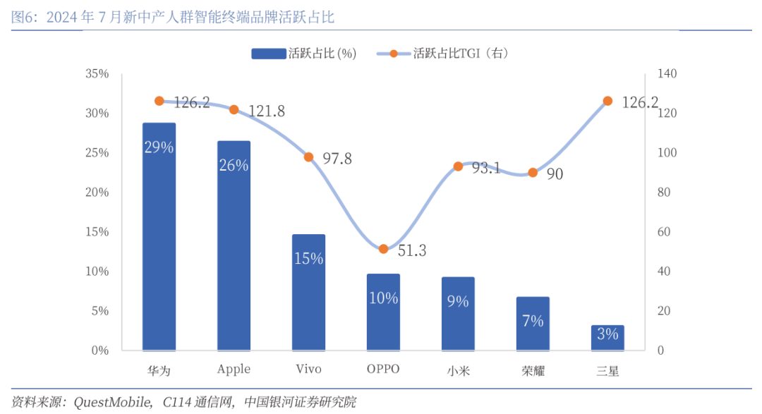 根据QuestMobile发布的最新数据,结合在智能手机品牌的选择上,华为和苹果成为这一群体的首选,两者的市场份额合计超过一半。具体而言,28.6%的新兴中产阶级倾向于选择华为手机,位居首位;苹果则以26.3%的市场份额紧随其后。这两个品牌的使用率同比增长了13%,显示出其在高端智能手机市场的领导地位。相比之下,VIVO、OPPO、小米、荣耀和三星等其他品牌的活跃度在新兴中产阶级中有所下降。