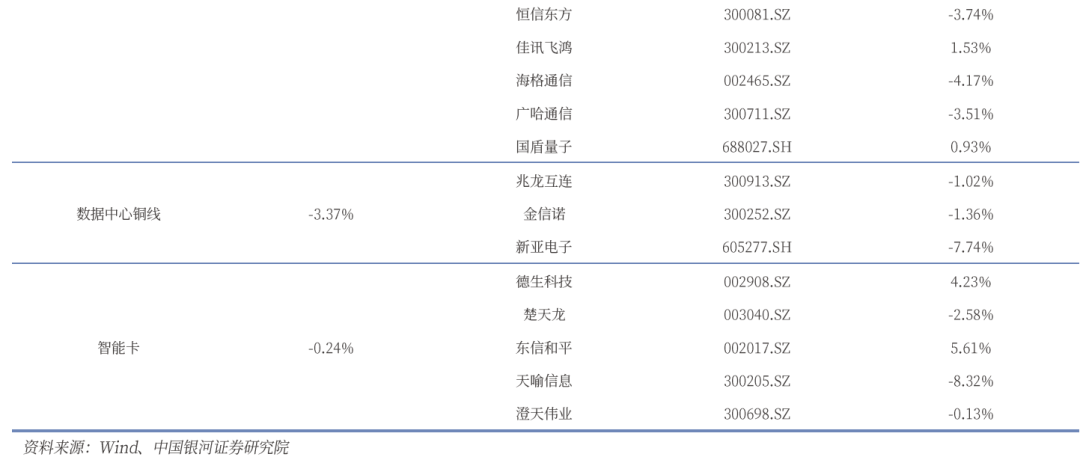 通信板块三级子行业中,通信网络设备及器件、通信线缆及配套、通信终端及配件、通信应用增值服务四个板块表现均有所上涨,通信网络设备及器件涨幅最高。进一步细分子板块方面,载波通信及电网、光模块子板块相关标的表现较好,板块涨幅为7.09%、6.06%。